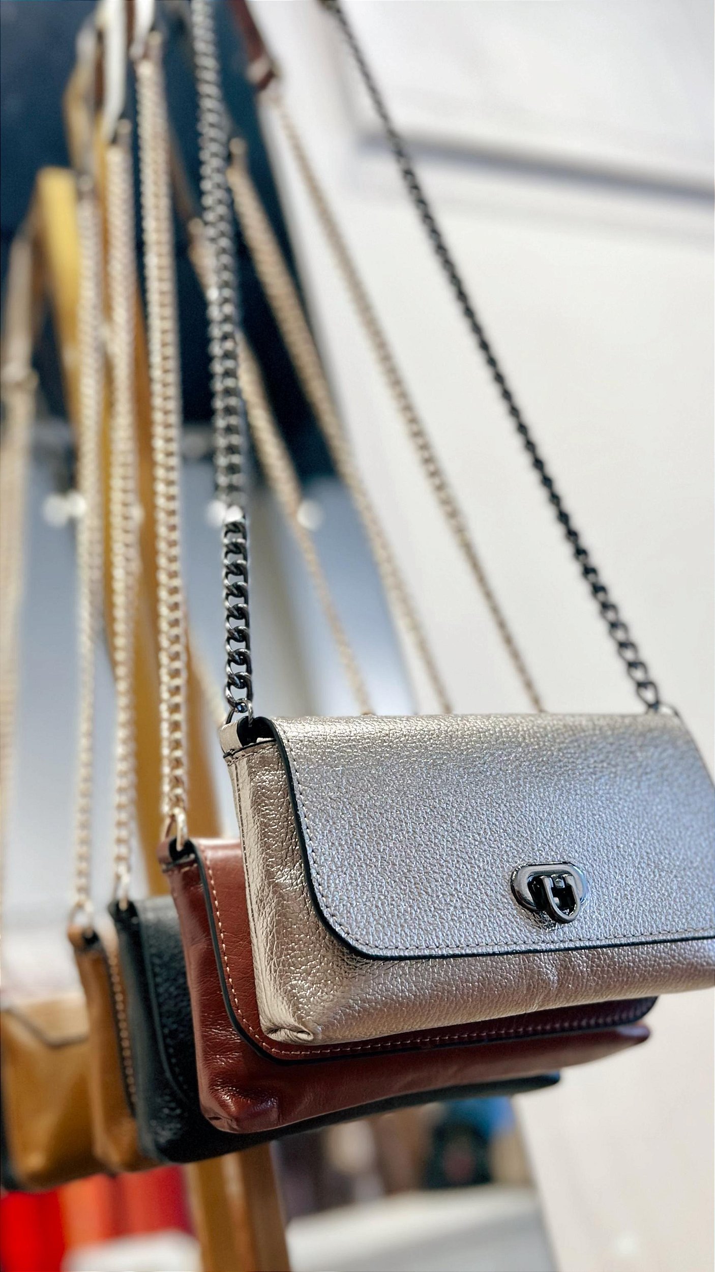 Possui alça fixa de corrente com protetor de ombro em couro.